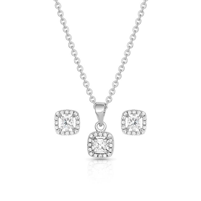 Silver toned "arms" hold the center stone in place acting like a ray coming from the center to the outer halo. Earrings have stainless steel hypoallergenic posts. Necklace pendant sits on a princess length 19 inch chain.