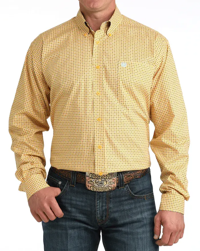 Golden Yellow Button Down Blue Print