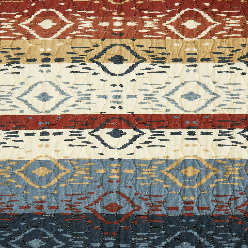 Using colors borrowed from the earth and sky, we painted a buffalo herd roaming freely across a field of Aztec patterns. This quilt reverses to a geometric ombre design, interspersed with bold alternating stripes and flowing tribal motifs. Finish the look with other accessories from our range of Western and Southwestern collections.