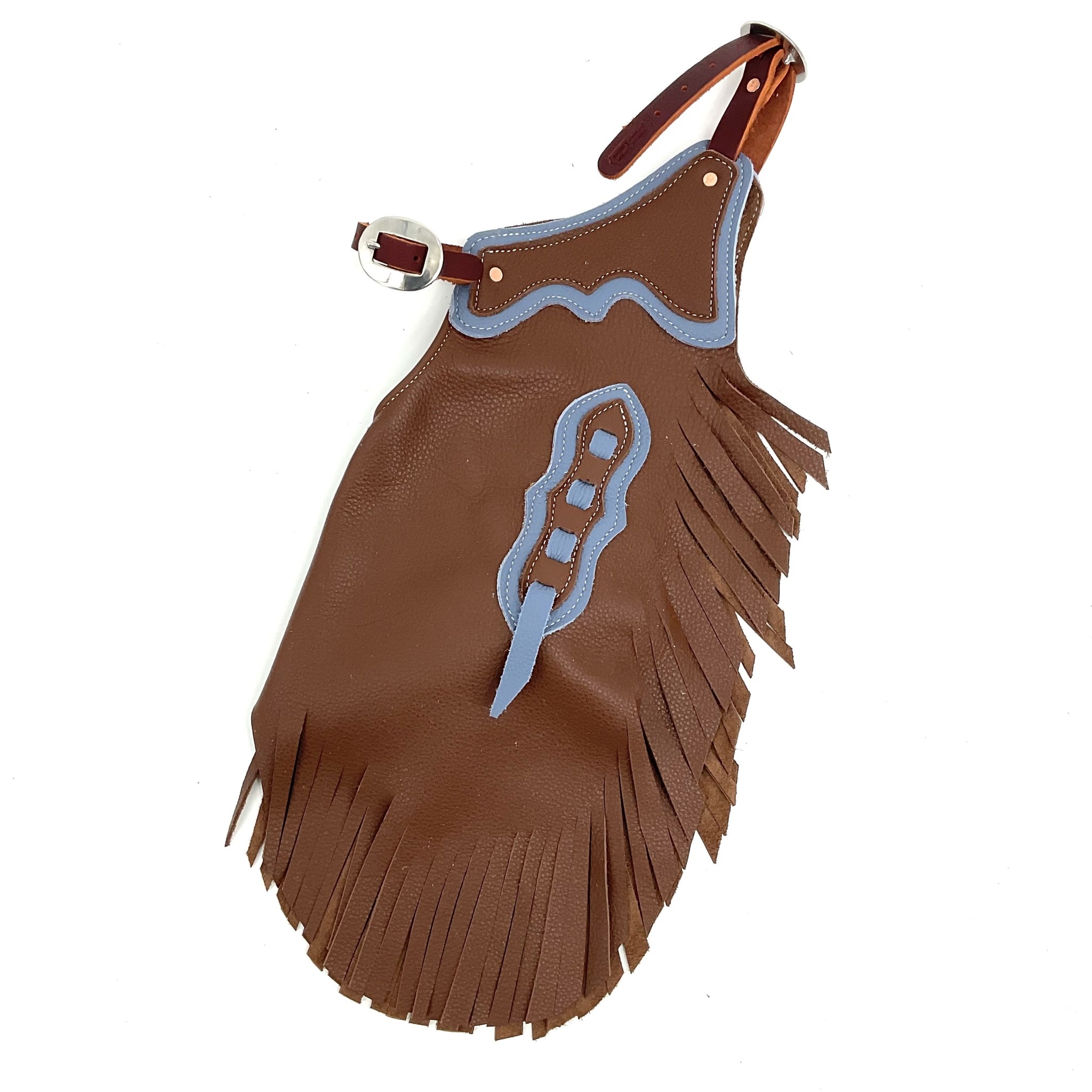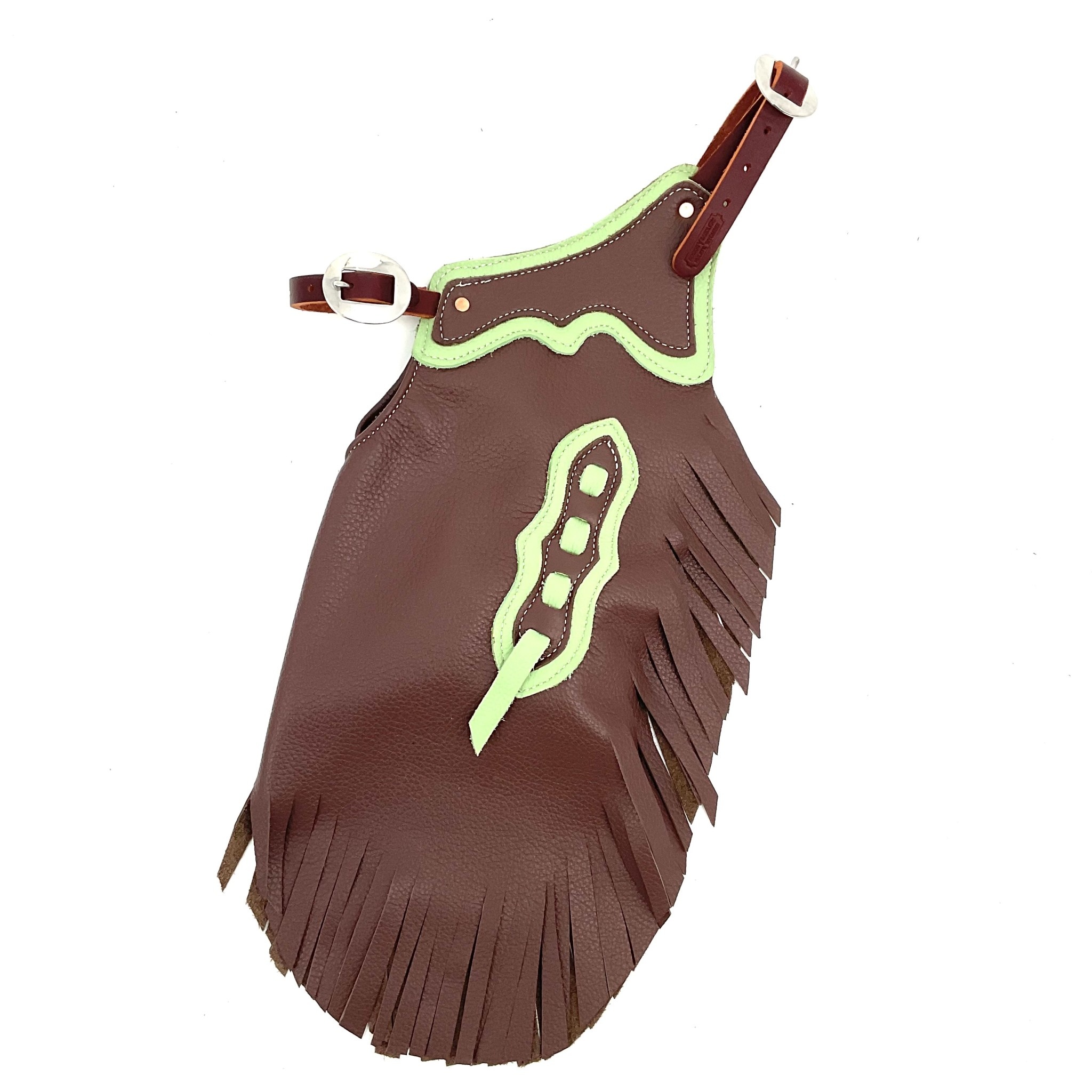 Leather kids chinks in earth tones, 17" from hip belt to end of fringe, adjustable buckle on front and back and snap leg closure.