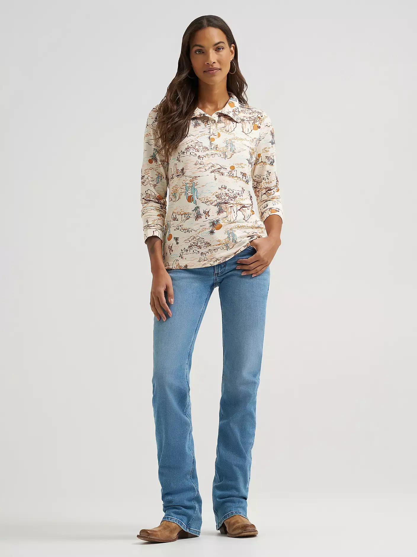 It’s the details that make a difference, including a bold print bringing vintage flair to any outfit. The mock-neck design and partial snap placket let you adjust your look for style and warmth whenever you need. Perfect for layering, this pullover blends practicality with cowgirl personality—so you can stay cozy without sacrificing your signature look.