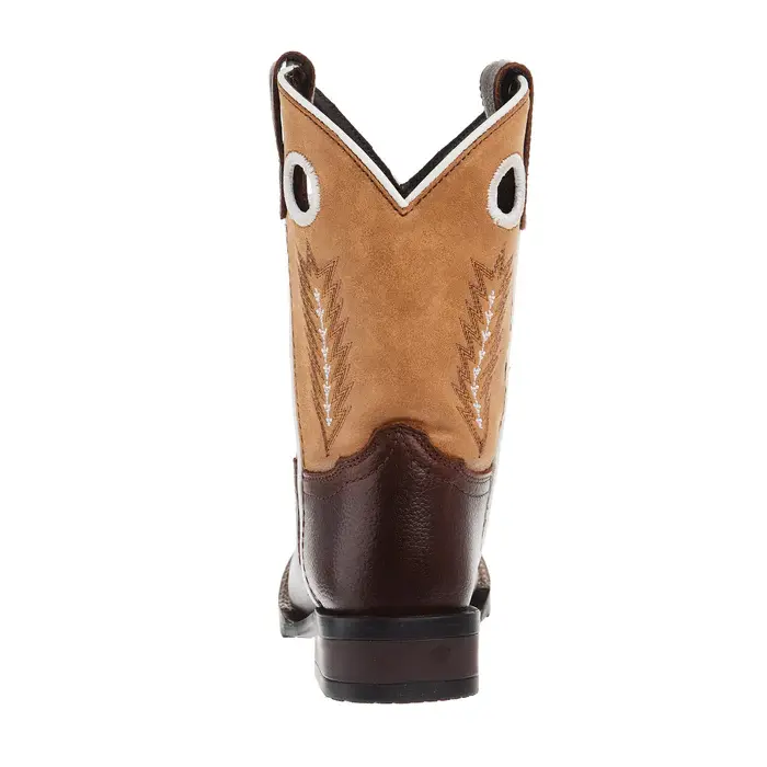 These boy's western James boots from Roper have a 9 inch tan leather pull on shaft that features embroidered pull holes and a feather western stitch design. They have a brown smooth vamp with a wide square toe and they have a removable molded insole with moisture wicking linings. The outsole is a flexible TPR with a 1 1/4 inch heel. Leather.